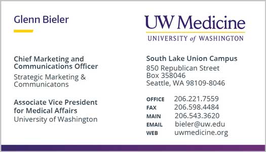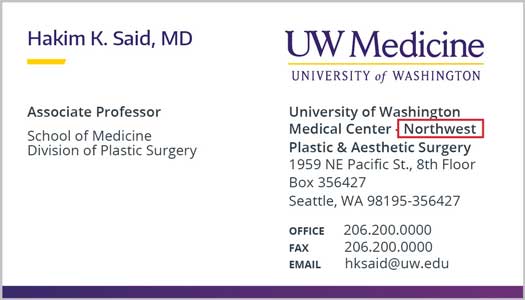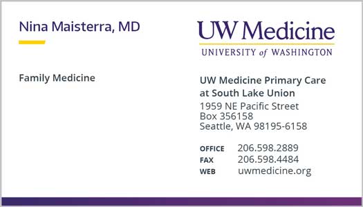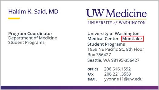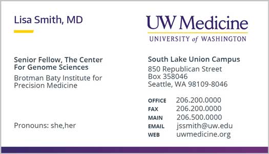 Personal pronouns is a way to respect individuals and create an inclusive environment for all of UW Medicine. Below is an example where pronouns will be placed on all business cards. Approved pronouns on business cards will be the following: she, her, he, him, they, them, their.