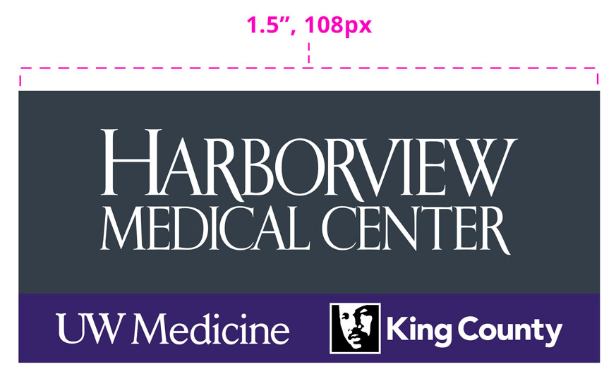 - The preferred lockup features a gray background behind the “Harborview” text and a purple bar behind the UW Medicine and King County logos.