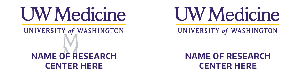 While we recommend remote treatment with the primary logo, UW School of Medicine research centers may also have a unique visual identity, such as a design or icon, to distinguish their work from others in the field. (This does NOT apply to UW Medicine patient-facing clinical centers, programs or institutes.) This may include a logo lock-up with the UW Medicine wordmark.